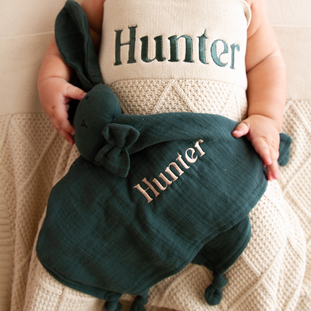Included: Diamond Knit Baby Blanket & Organic Cotton Muslin Bunny Baby Comforter
